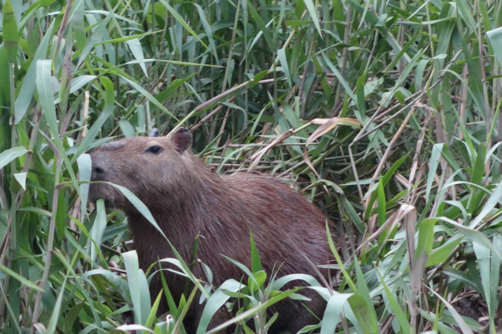 Victor stops you. He’s just spotted a black cayman, related to alligators, near the paddleboat you’re going to get on. But you don’t see the cayman, as it’s shy and slithers into the tall grass. As you get aboard the boat, Victor lets you know that this is a popular area for anacondas, which are such giant snakes that they are a predator for jaguars. Jaguars. You shiver.