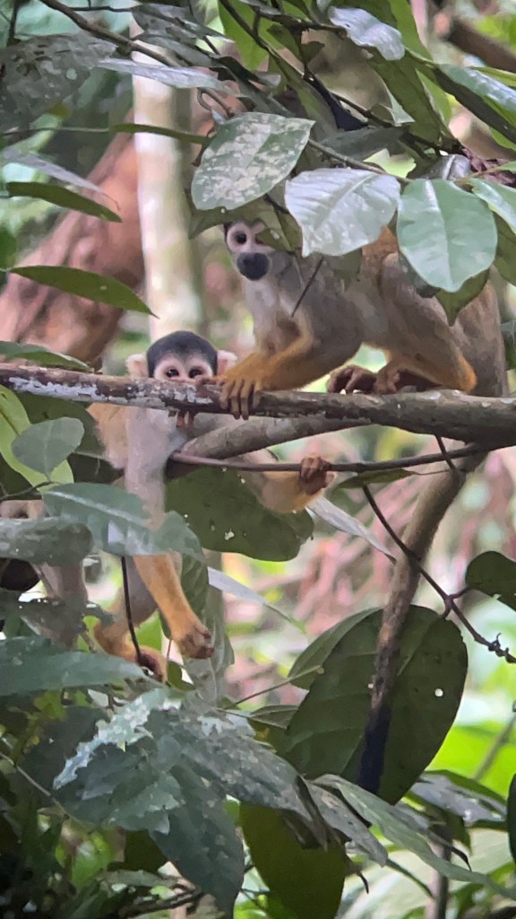 After a couple hours at the claylick and a delicious boat breakfast, you head back to the lodge. When you arrive, you take a short nap before heading to lunch. You’ve lived twenty lifetimes in less than a day. As you walk to lunch, you see dozens and dozens of monkeys, treating themselves to the bananas growing in the trees at the lodge. They are so adorable, and you literally cannot believe how close they let you get.