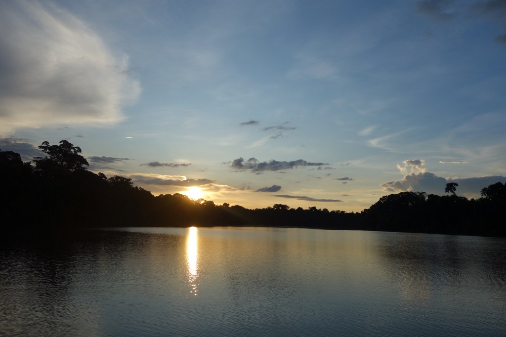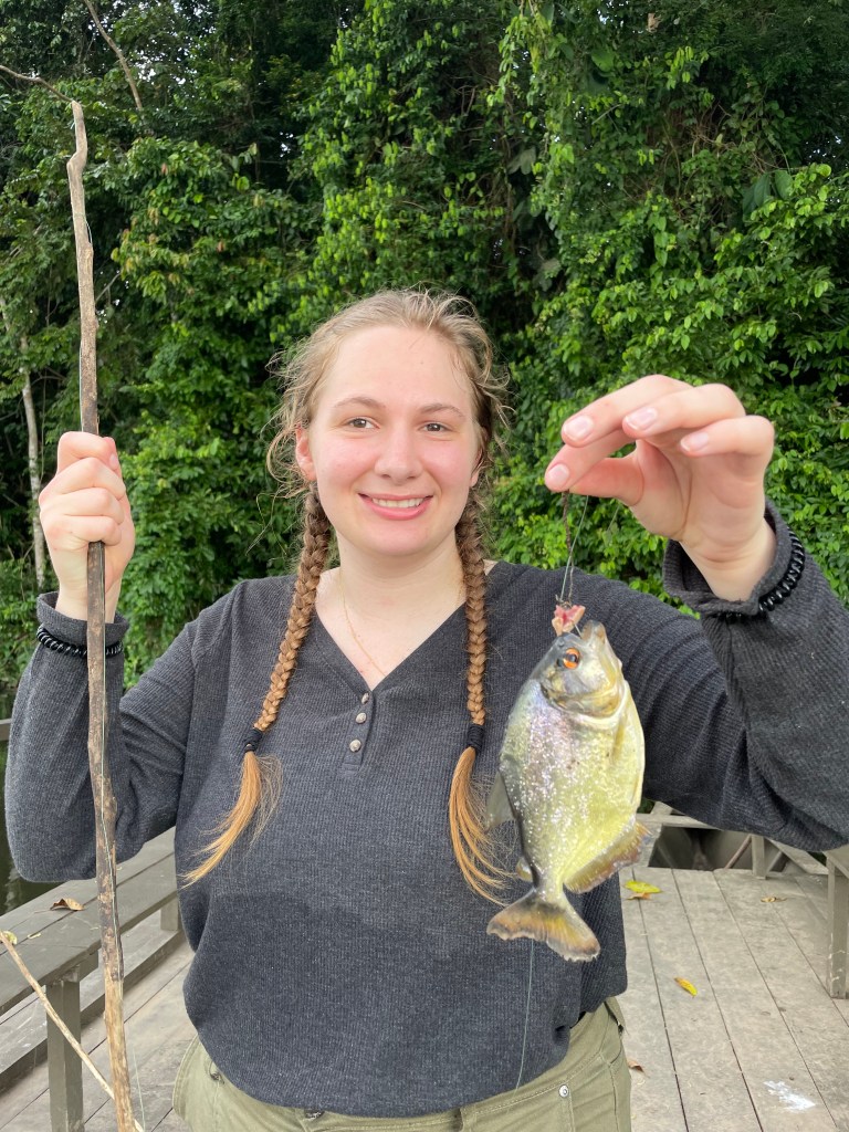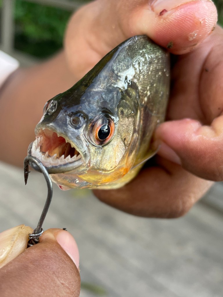Victor ties the boat to a tree and brings out a small bag of bait and two handmade fishing poles. You’ve never fished before, so you’re not confident you’ll catch anything, but you give it a shot. You’re hunting for piranhas. After several failed attempts, you catch your first fish. It’s like Stardew Valley on steroids. You subsequently catch (and release) three more fish. Victor tells you that this should be your new hobby. You feel kinda goated at it. You paddle more around the lake as the sun sets. You can’t believe how beautiful it is here.